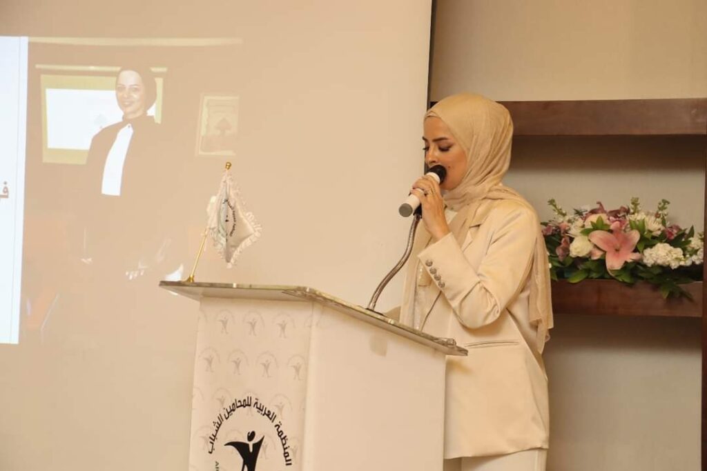 وأشارت الى إن أوطاننا العربية هي أمانة في أعناقنا وإن هموم هذه الأمة ونصرة الدفاع عنها هو واجب علينا كمحامين في الدفاع عن حقوق أمتنا العربية.