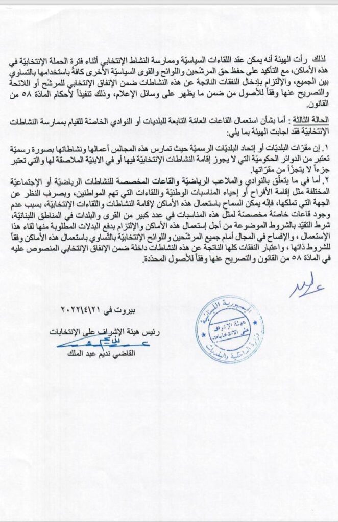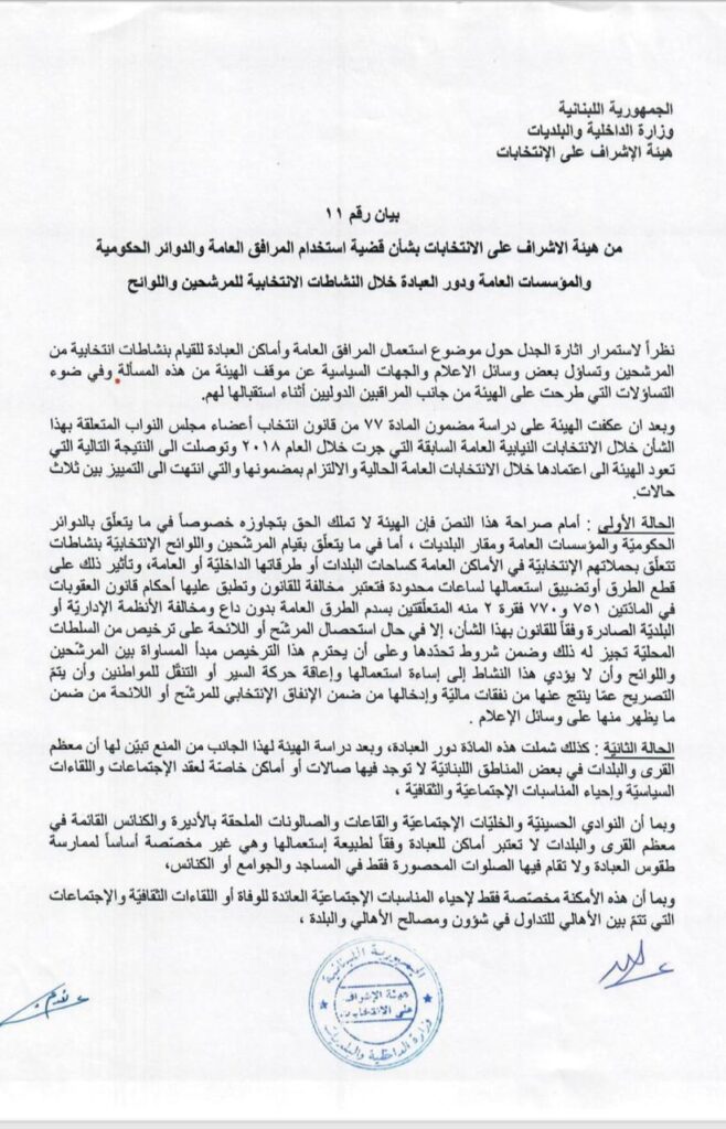ما يصّوره موقع “التيار” الاكتروني على أنّه مخالفة يتم بحسب ما ينص عليه القانون. لذلك، ندعوكم لمراجعة البيان رقم 11 تاريخ 21/4/2022 الصادر عن هيئة الإشراف على الانتخابات والذي أجاز في المادة الثانية منه عقد اللقاءات السياسيّة وممارسة النشاطات الانتخابية أثناء فترة الحملة الانتخابية في دور العبادة شرط استخدامها بالتساوي بين جميع المرشحين.